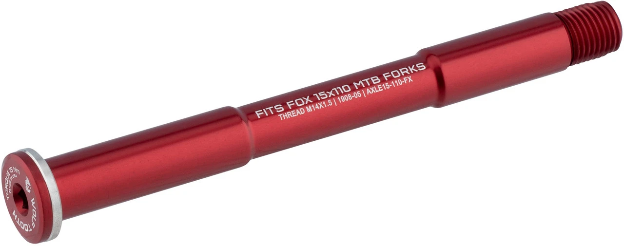Spécifications :Largeur :roue avant : 110 mmDiamètre de l’axe :15 mmInformations techniques :Utilisation :roue avant : 15 x 110 mmType :axe traversantMatériau de l’axe :aluminium (7075-T6)Longueur de l’axe :155 mmDiamètre nominal :M14Pas de filetage :1.5Longueur du filetage:15 mmCompatibilité :fourches à suspension Fox Racing Shox 15 mm (Boost)Caractéristiques :similaire à l’axe Fox Kabolt, mais avec plus d’options de couleurs et le logo Wolf Toothavec rondelle en acier plaquépour clef hexagonale de 6 mmcouple de serrrage : 12 – 15 Nmfabriqué aux USA